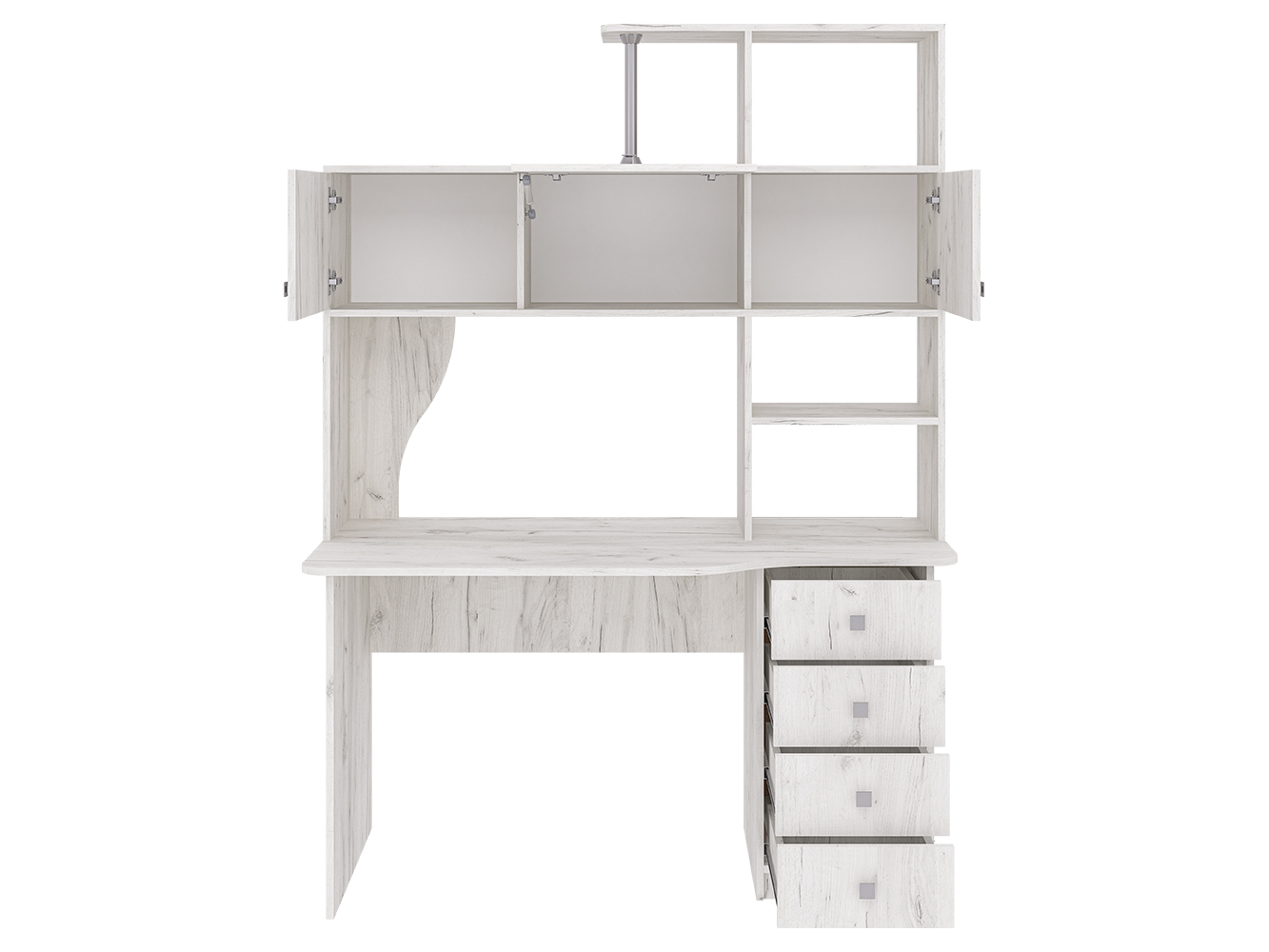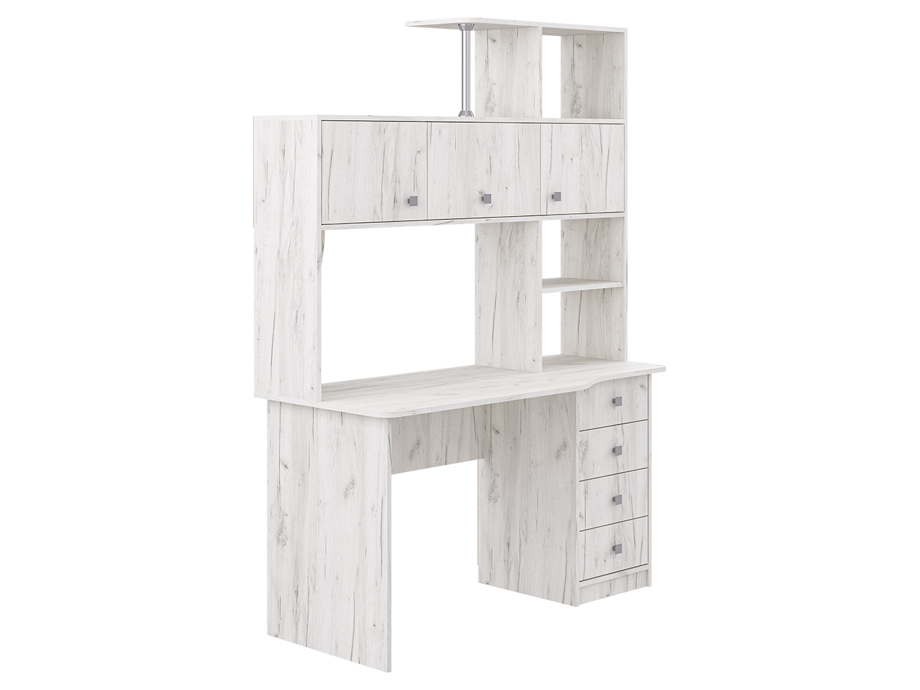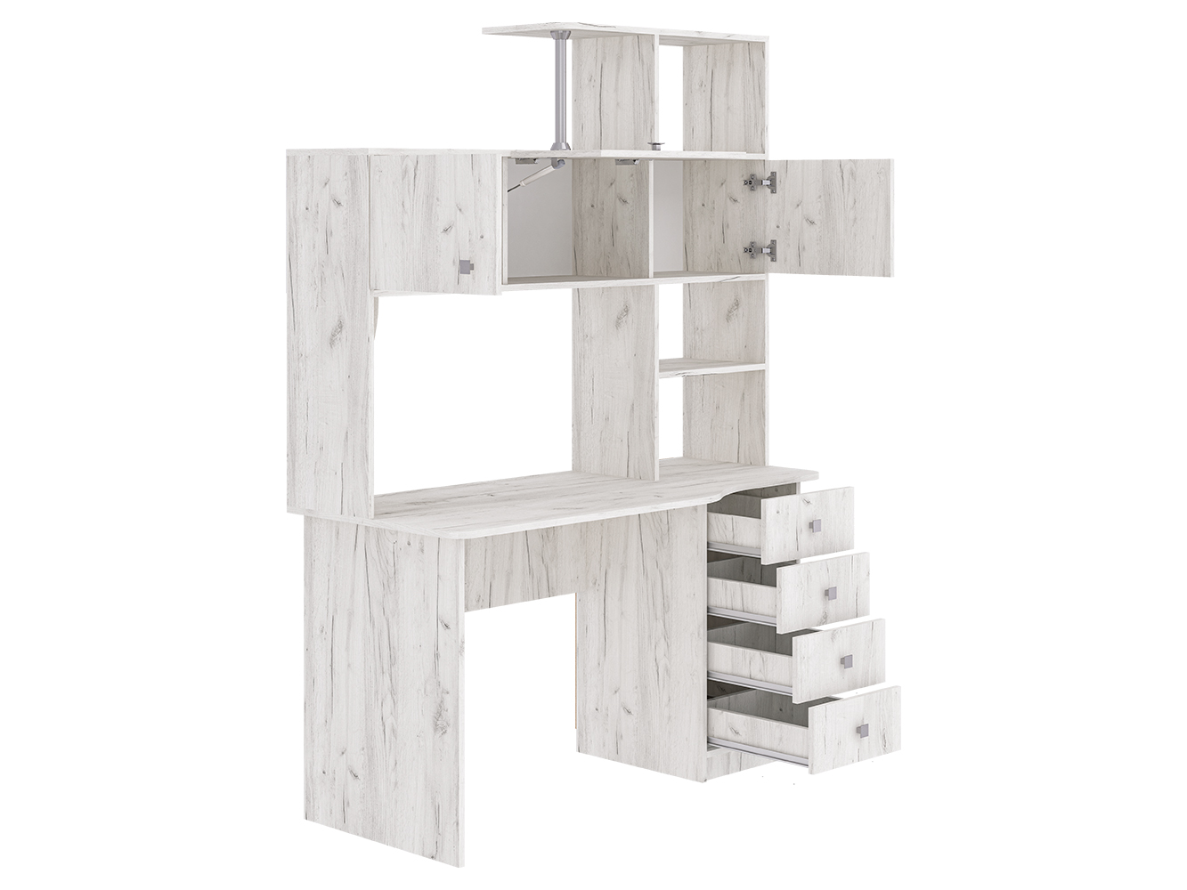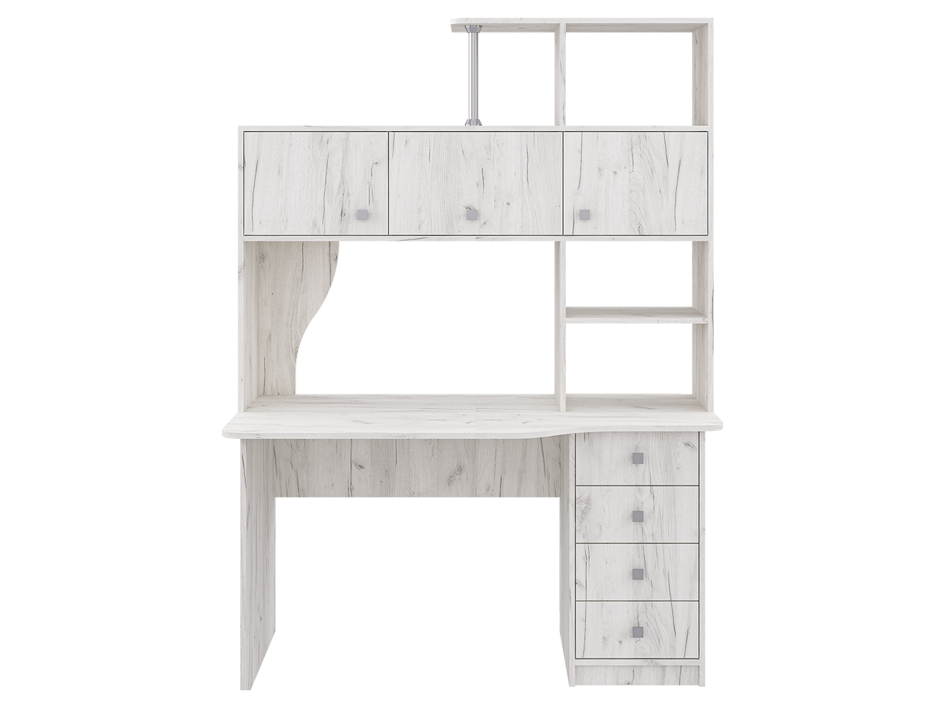 Стол рабочий с надстройкой «СК-16», ВхШхГ 1900х1390х690мм Стол с фигурной столешницей включает в себя: четыре ящика полного выдвижения (шариковые направляющие), четыре открытые ниши, дополнительную полку на опоре цвета «хром». Края сглажены для комфортного пользования, на фасадах используются декоративные ручки. Размер под монитор 500х926. Изделие МФ «Пирамида» выполнено из высококачественного, износостойкого и экологичного материала – ЛДСП класса Е1, толщиной 16мм. Края обработаны ударопрочной кромкой ПВХ, что значительно увеличивает срок эксплуатации изделия. Для сборки используется фурнитура от ведущих мировых производителей. Все изделия фабрики сертифицированы и абсолютно безопасны для здоровья