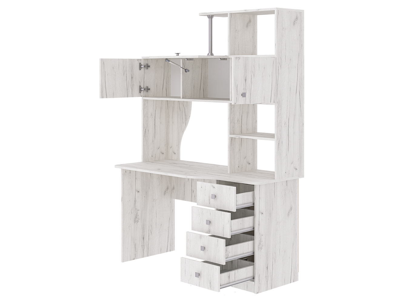 Стол рабочий с надстройкой «СК-16 new», ВхШхГ 1900х1390х690мм Стол с фигурной столешницей включает в себя: четыре ящика полного выдвижения (шариковые направляющие), четыре открытые ниши, дополнительную полку на опоре цвета «хром». Края сглажены для комфортного пользования, на фасадах используются декоративные ручки. Размер под монитор 500х926. Изделие МФ «Пирамида» выполнено из высококачественного, износостойкого и экологичного материала – ЛДСП класса Е1, толщиной 16мм. Края обработаны ударопрочной кромкой ПВХ, что значительно увеличивает срок эксплуатации изделия. Для сборки используется фурнитура от ведущих мировых производителей. Все изделия фабрики сертифицированы и абсолютно безопасны для здоровья.