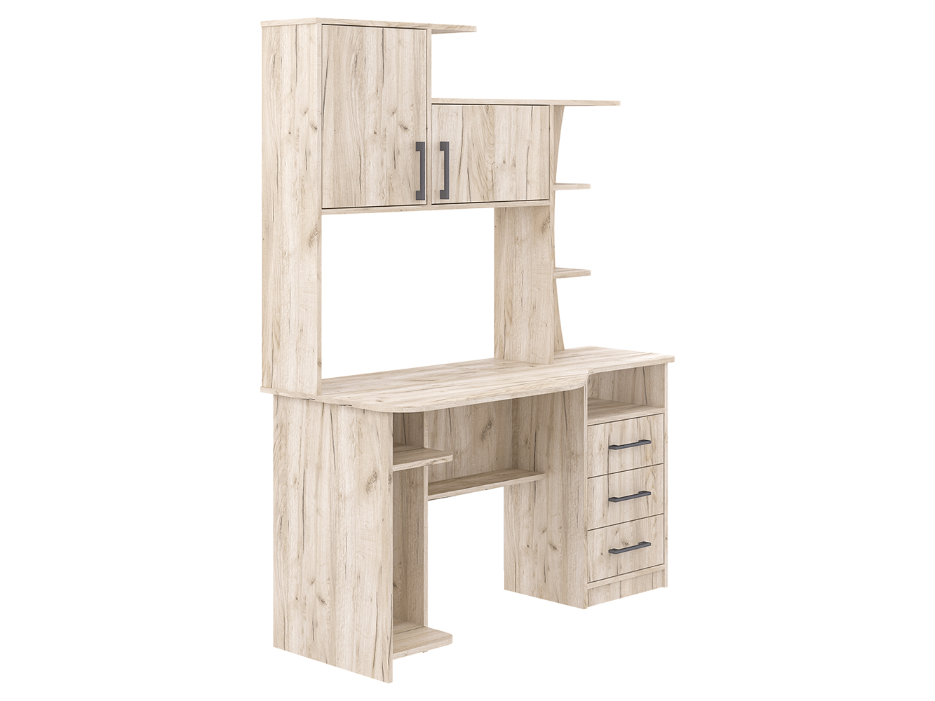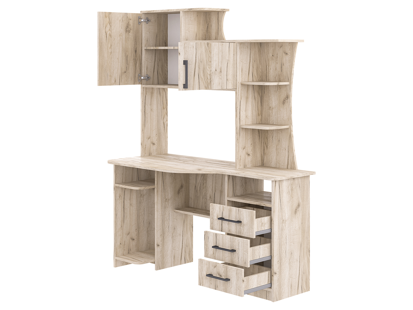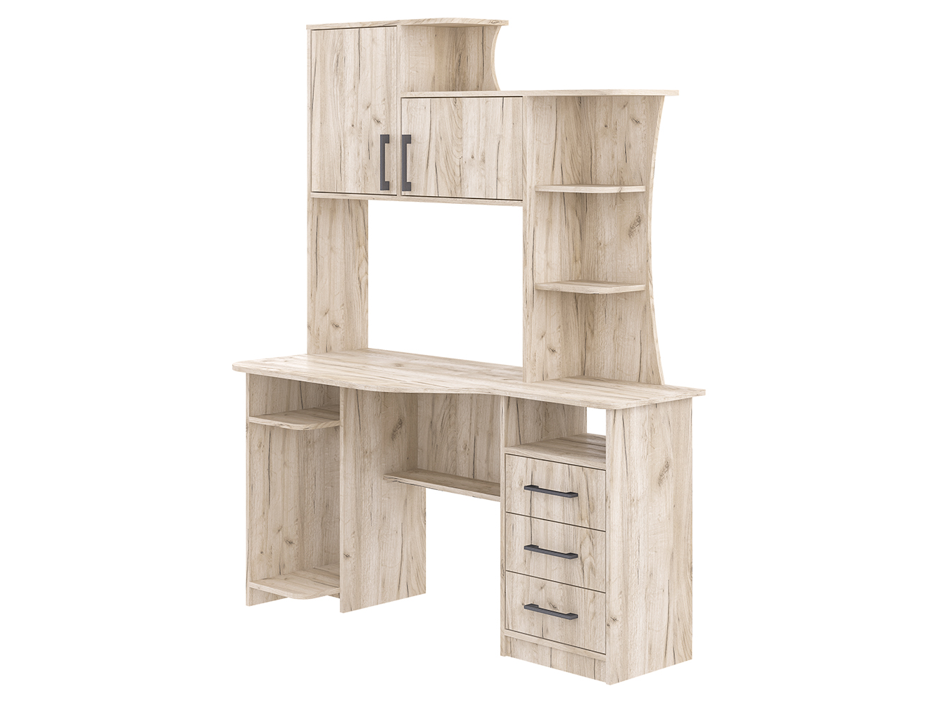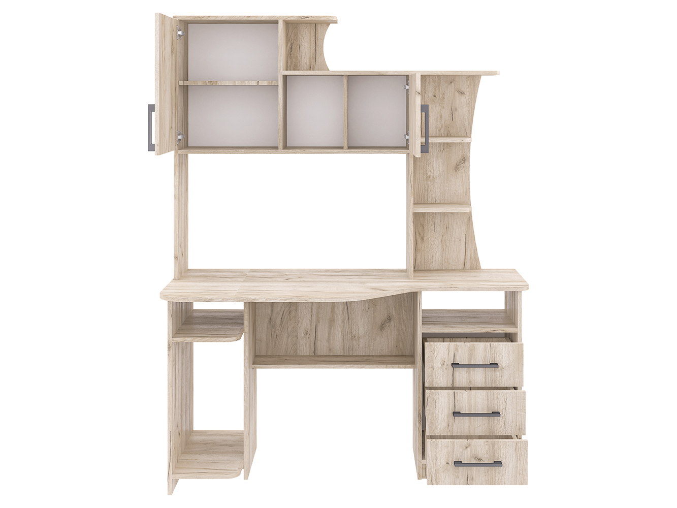 СК-19 - большой, вместительный и очень удобный компьютерный стол для работы и учебы. Здесь и широкая столешница, и обилие шкафов и полок. Так, модель снабжена стационарной тумбой с тремя вместительными выдвижными ящиками и открытой нишей. Рядом под столешницей есть полка для документов. На столе можно установить как стационарный компьютер, так и ноутбук. Для первого случая предусмотрена отдельная ниша под системный блок или же портфель, сумку. Если говорить о верхней части стола, то надстройка содержит различные по вместимости полки, и 2 закрывающихся шкафчика с распашными дверцами. Крыша надстройки позволяет также использовать дополнительную полезную площадь для размещения оргтехники, акустики, папок и любых аксессуаров.