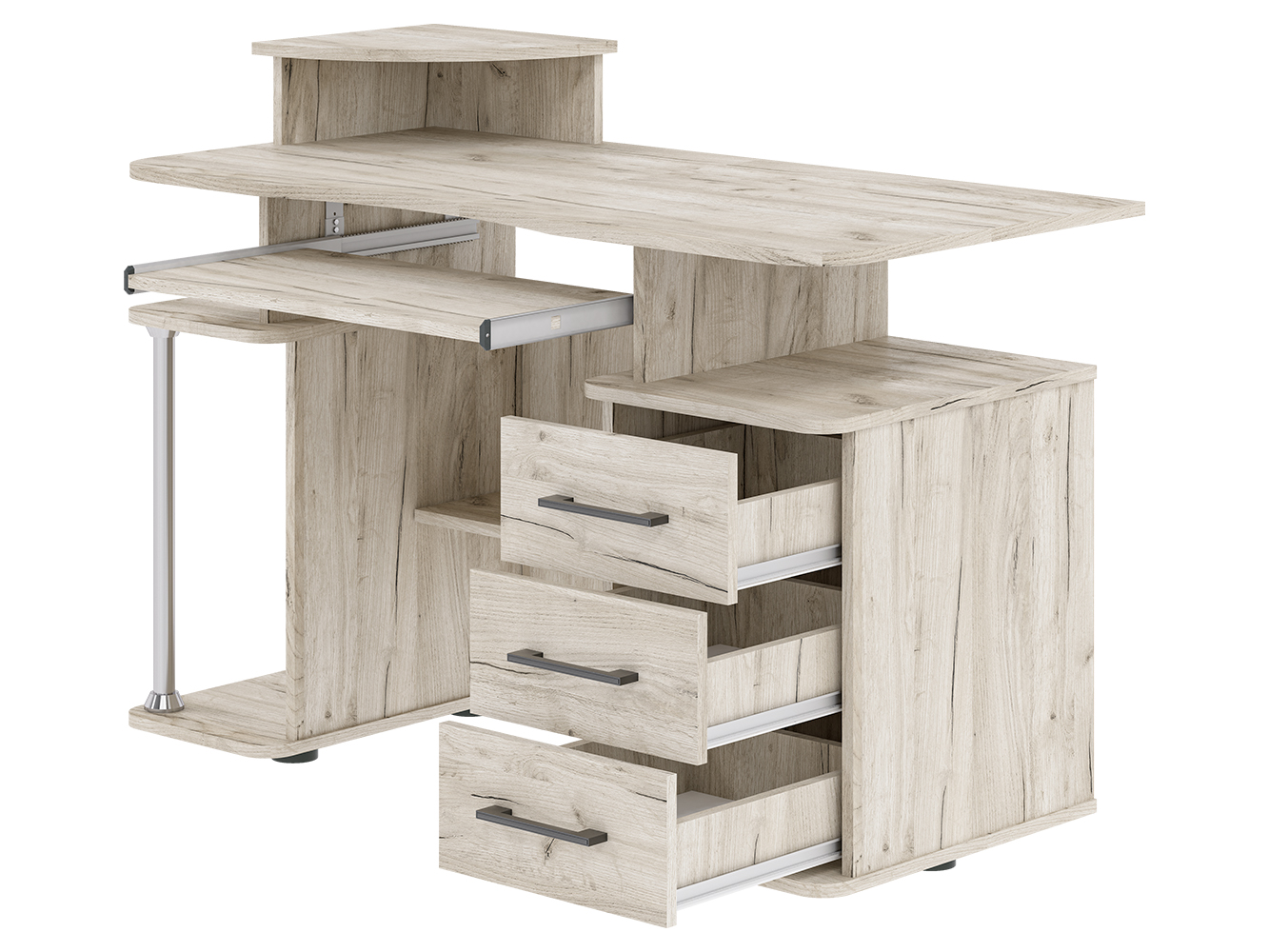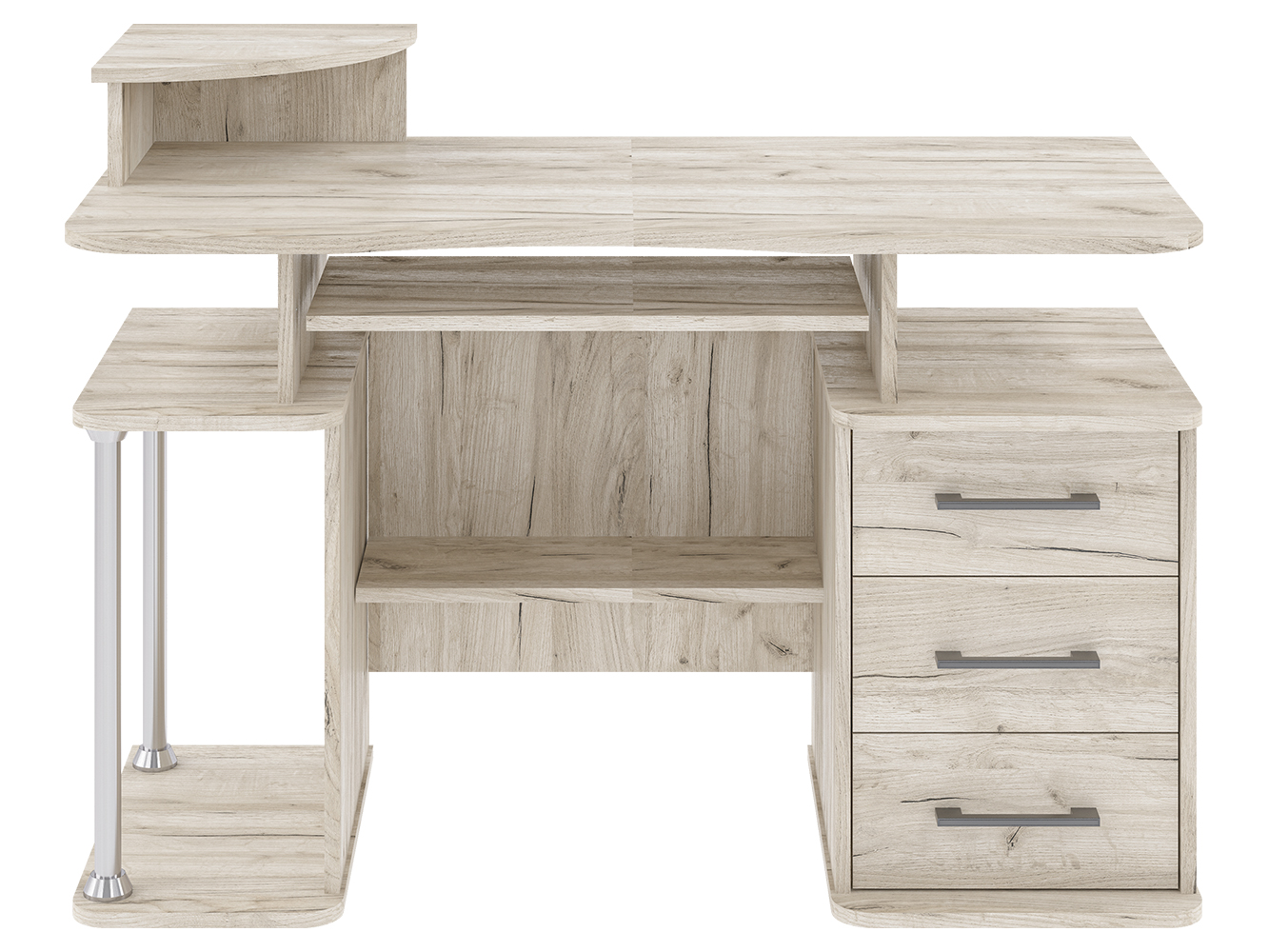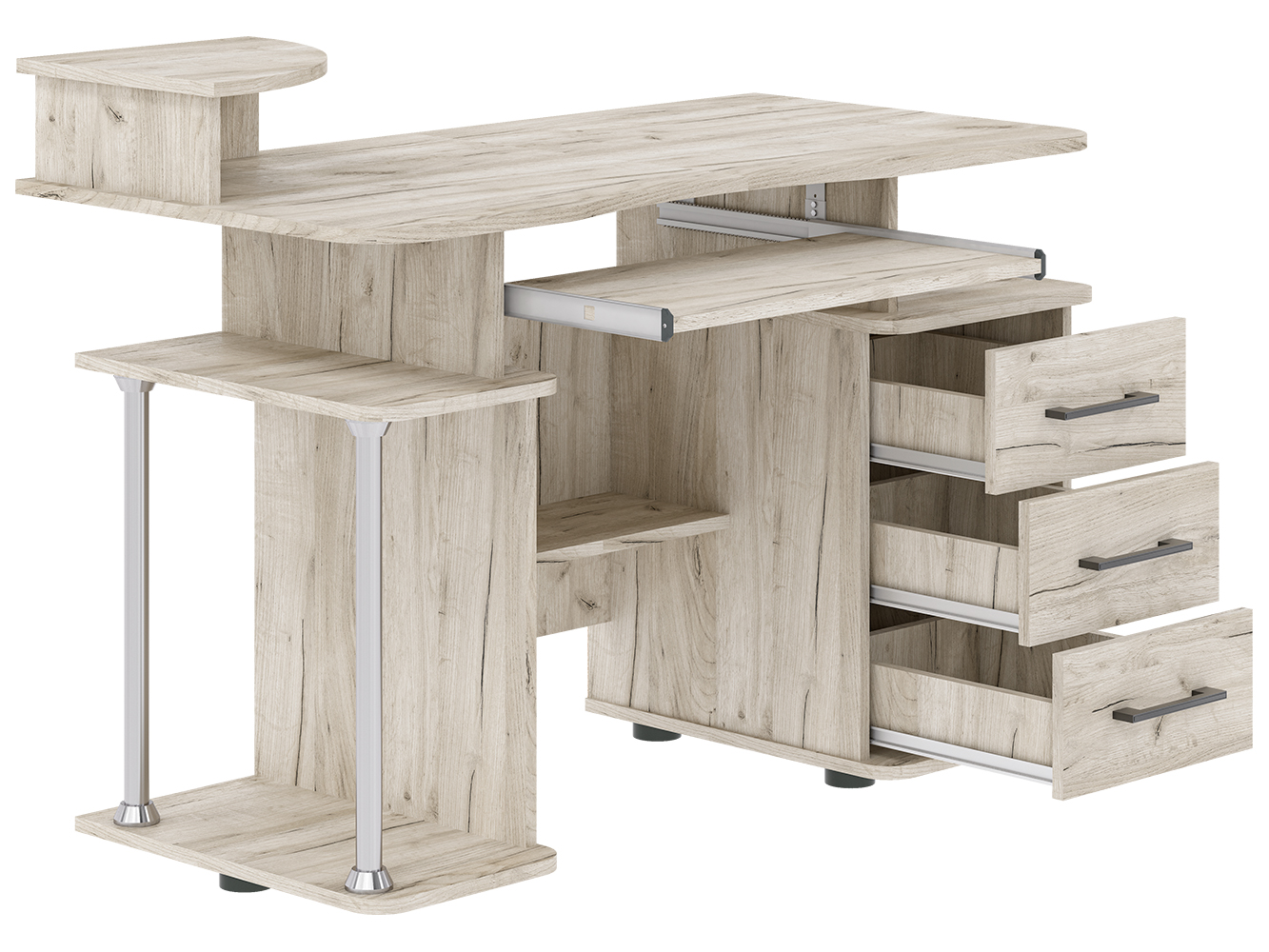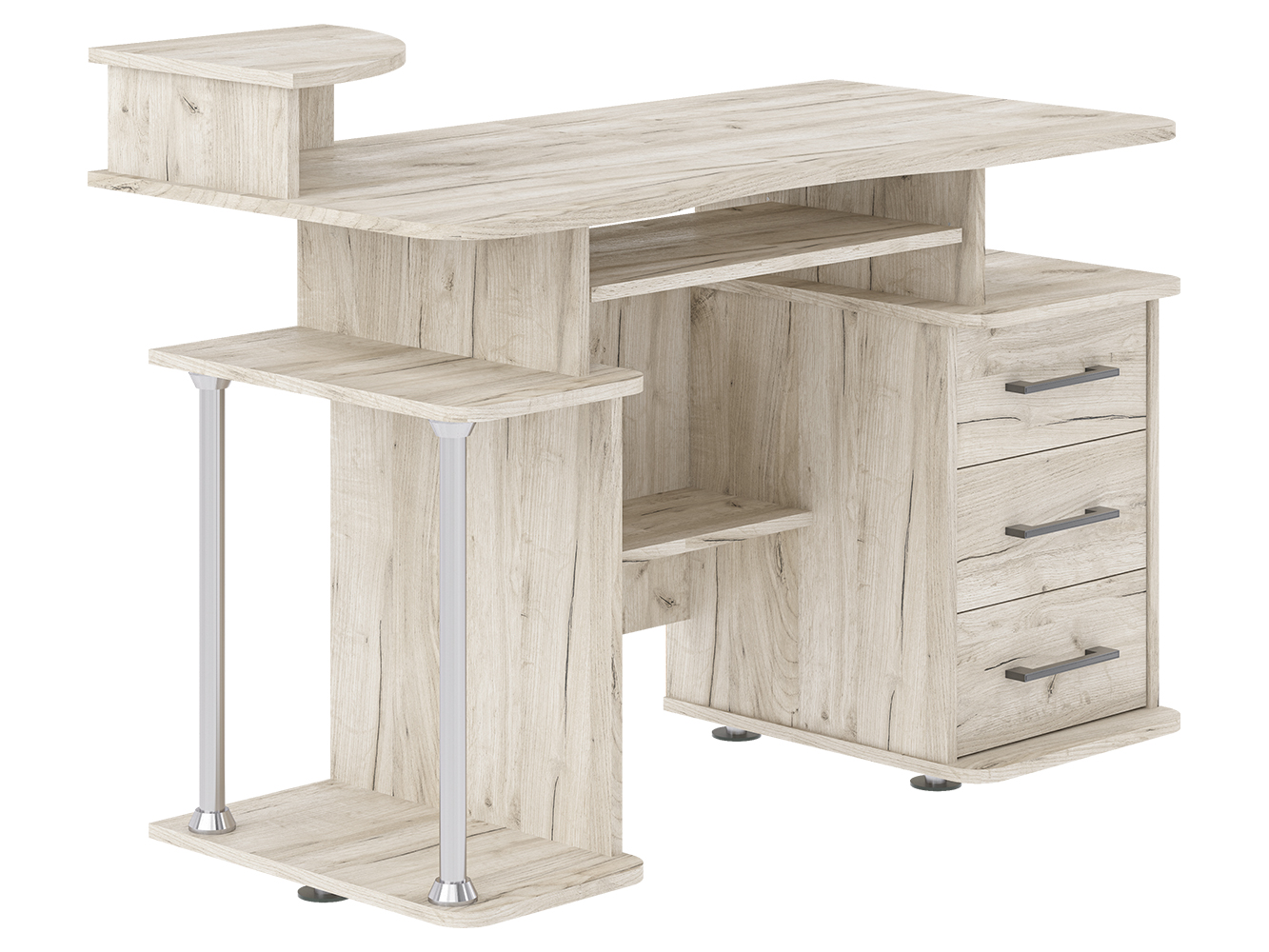 Стол компьютерный СК-22 достаточно прост в конструкции и вполне эргономичен. Данная модель снабжена тумбой с 3-мя выдвижными ящиками и открытой нишей для бумаг. Стол имеет выкатную полку для клавиатуры и открытую полку в нижней части стола. Ниша для системного блока образует дополнительную полочку и декорирована хромированной трубой. Конструкция стола выполнена таким образом, что модель выглядит фигурной и будет интересно смотреться в любом интерьере. Роль надстройки стола выполняет подставка для монитора, образующая под собой полузакрытую нишу для каких-либо мелочей.