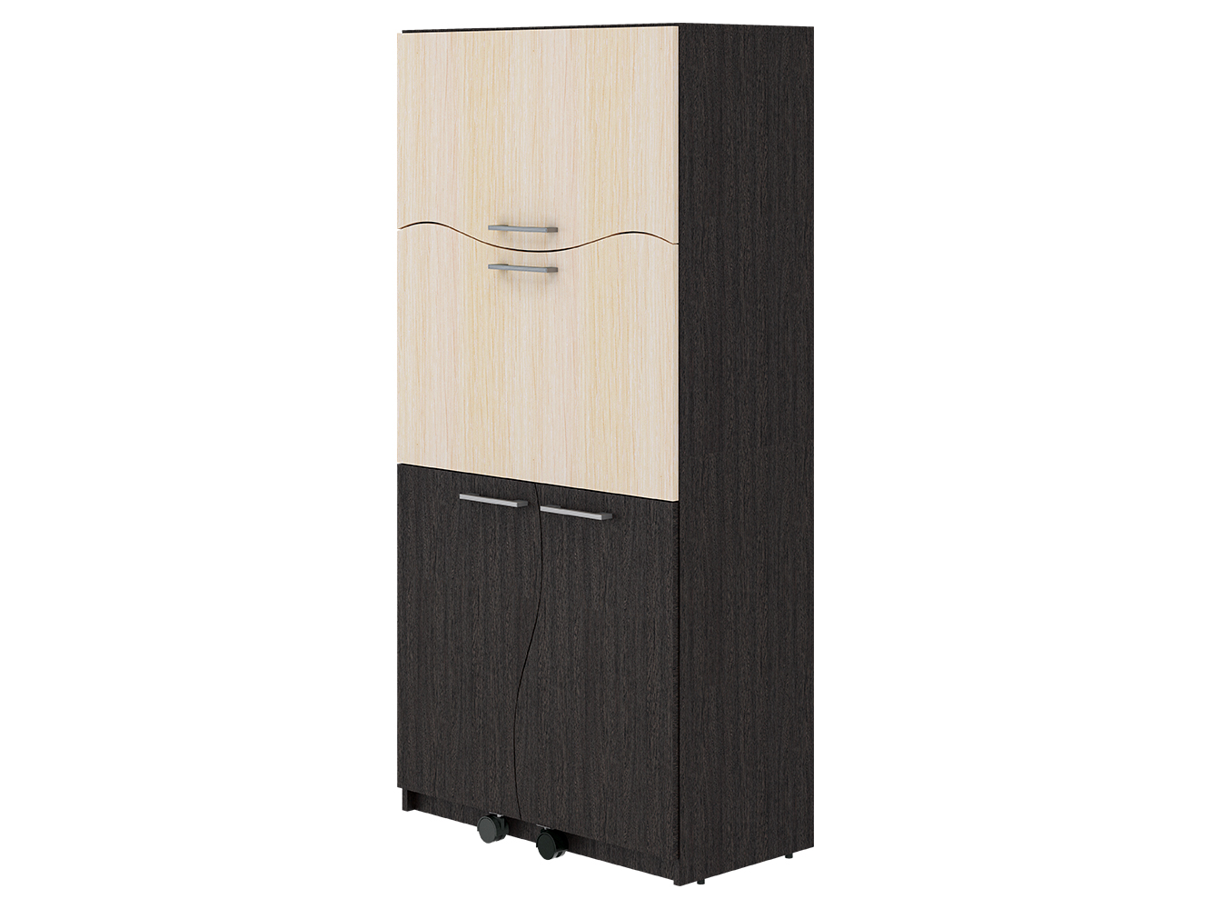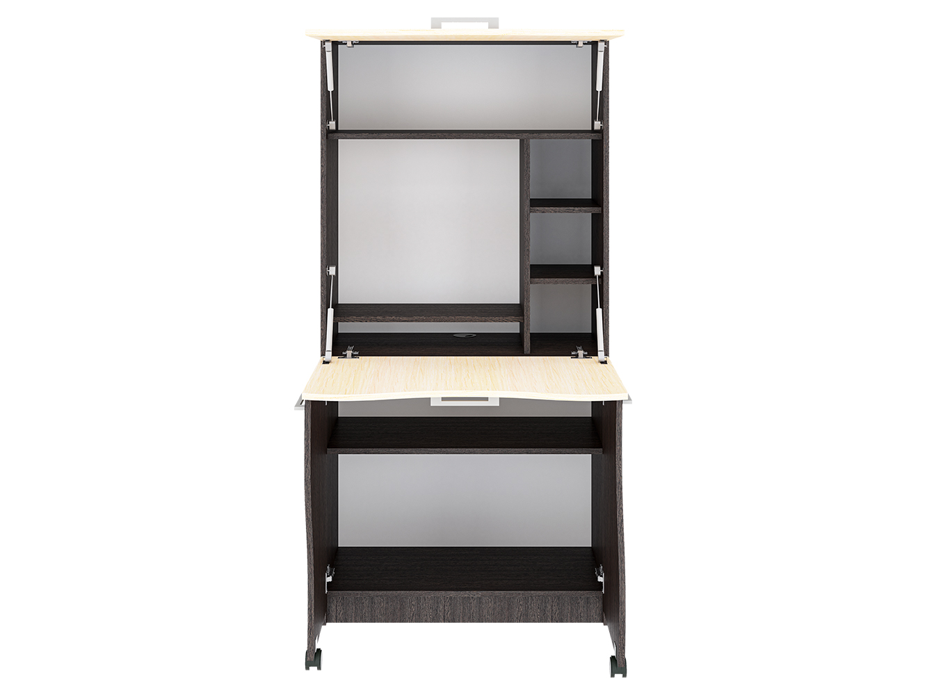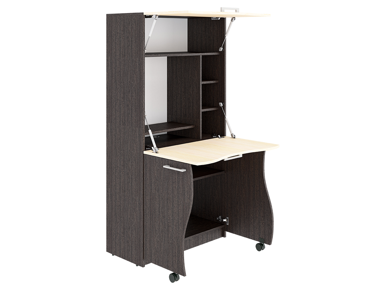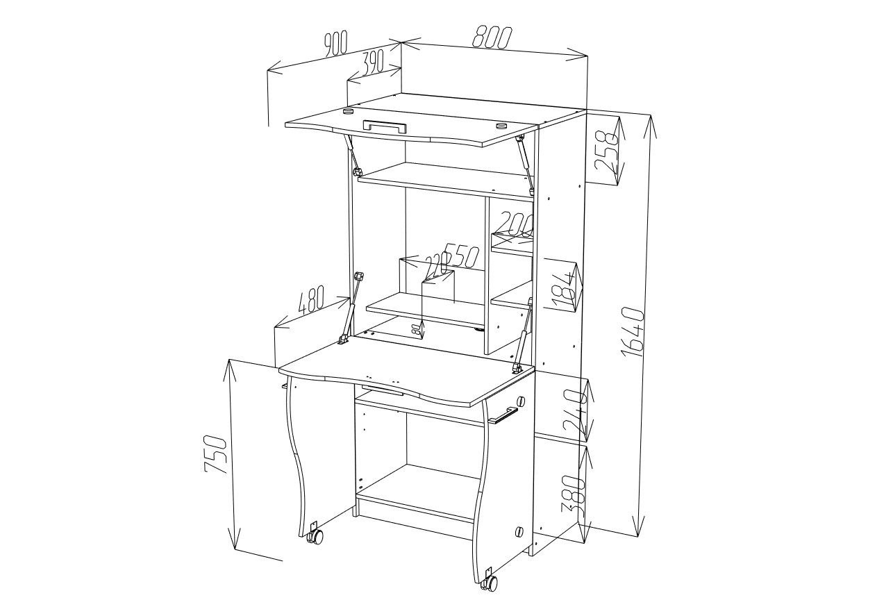 Один из плюсов - продуманная до мелочей конструкция и экономия места. Последнее особенно актуально для малогабаритных квартир. С виду стол СК-49 напоминает небольшой шкаф. но скрывается в нём полноценное рабочее место. Так, нижние дверцы становятся опорой для столешницы. Она, в свою очередь, трансформировалась в рабочую поверхность или подставку под клавиатуру из верхней дверцы. Удерживают двери в закрытом состоянии газовые механизмы. Также предусмотрена ниша для монитора, а в нижней части стола имеется открытая ниша для системного блока и горизонтальная полка для документов. Правая часть стола-трансформера снабжена 3-мя открытыми полками. В верхней части - открытая полка для оргтехники. Особенности: — Простая трансформация стола, позволяет быстро сложить его, освободив пространство в комнате — Высокий класс ЛДСП E1, 16 мм — Множество расцветок декора, что позволяет подобрать стол под интерьер комнаты