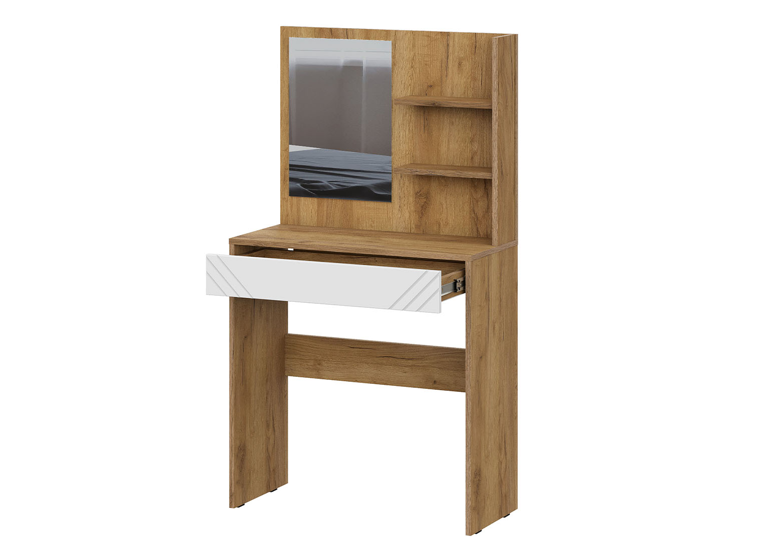 Туалетный стол с зеркалом из коллекции «Байкал» — практичное и элегантное решение для спальни.Фасад ящика выполнен из белого МДФ с выразительной фрезеровкой и лаконичным дизайном без ручки.Вместительный ящик на шариковых направляющих полного выдвижения обеспечивает удобный доступ к содержимому. Дополнительно предусмотрены две открытые полки для хранения косметики или аксессуаров. Зеркало встроено в конструкцию, что делает столик полностью готовым к использованию.