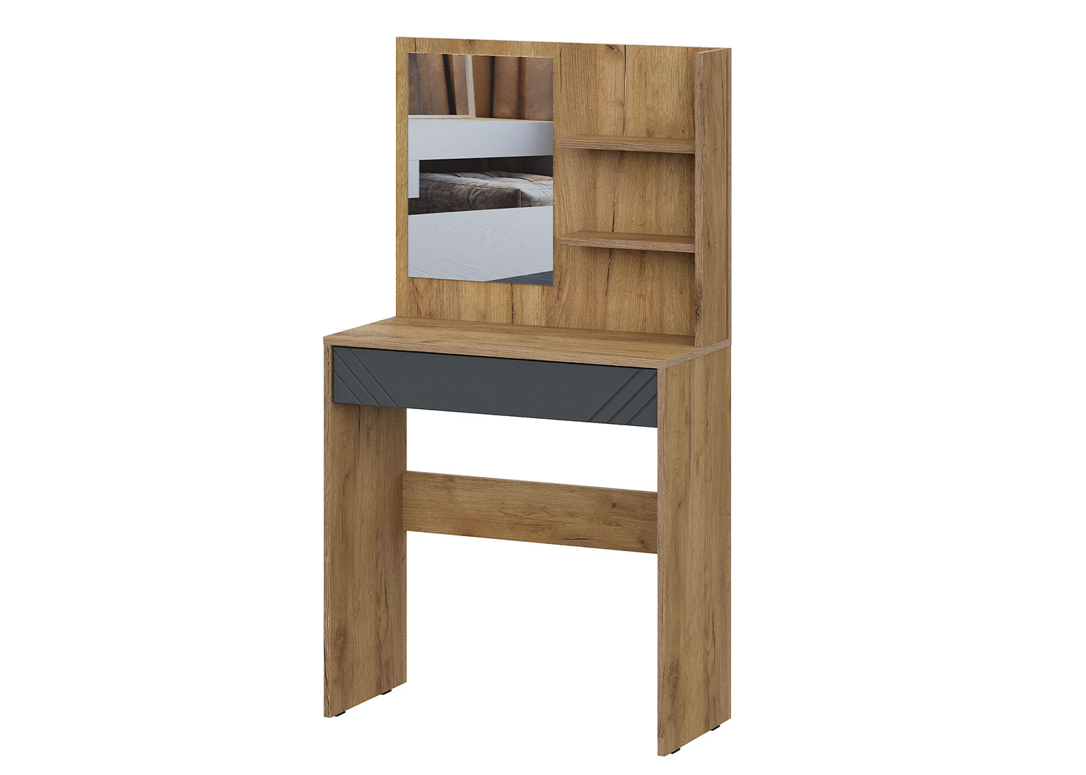 Современный туалетный стол с зеркалом из серии «Байкал» сочетает в себе функциональность и стиль. Фасад ящика выполнен из МДФ в графитовом цвете с аккуратной фрезеровкой и не имеет ручки — для лаконичного внешнего вида. Вместительный ящик оснащён шариковыми направляющими полного выдвижения. Открытые полки по бокам подходят для повседневных мелочей. Встроенное зеркало завершает образ — это готовое решение для зоны макияжа или ухода.