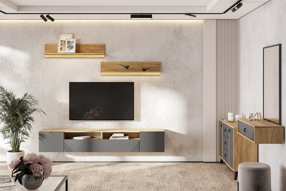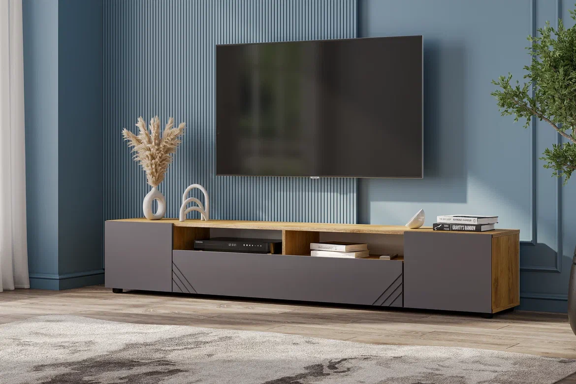 Тумба под ТВ из серии «Байкал» сочетает стильный внешний вид и функциональность, поэтому отлично подойдёт ко многим интерьерам.Распашные фасады из МДФ в графитовом цвете с фрезеровкой скрывают отсеки для хранения техники и других вещей. Тумба может быть установлена как на пол (в комплекте — пластиковые ножки), так и в подвесном виде. Петли с доводчиком.