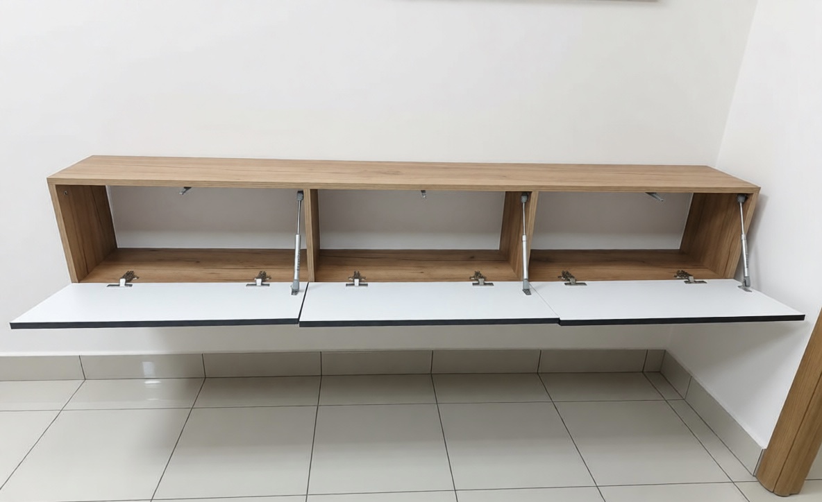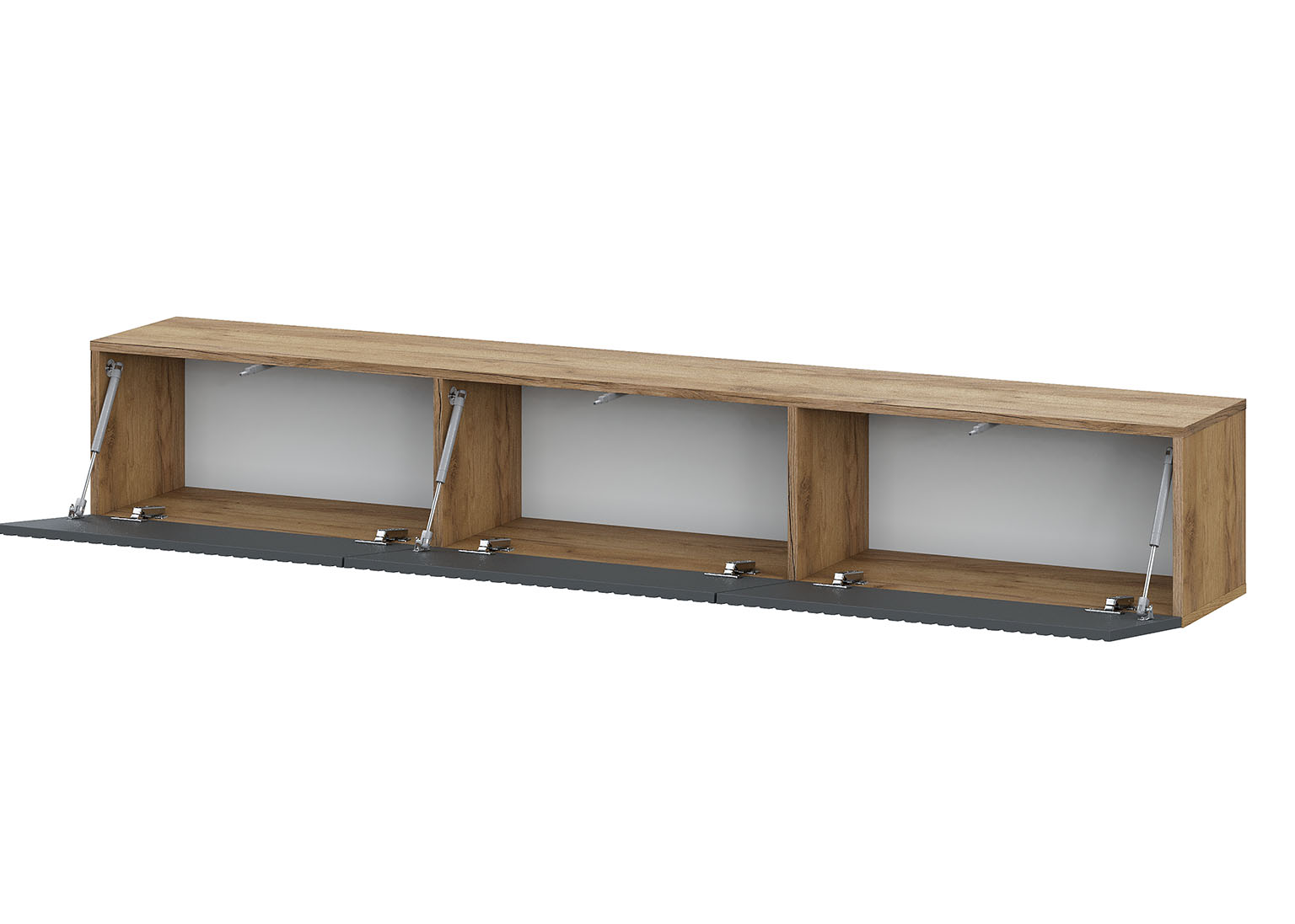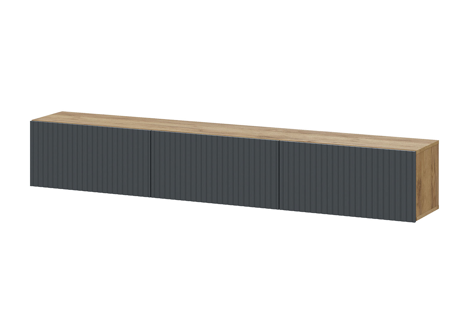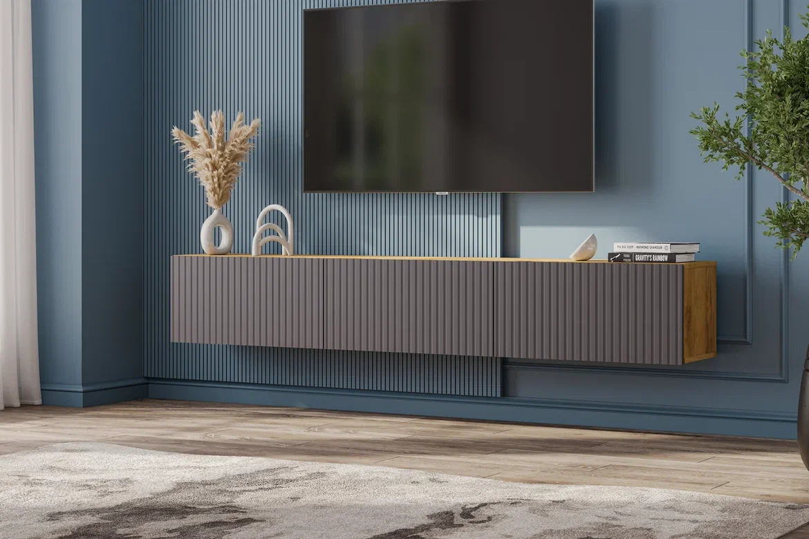 Подвесная тумба под ТВ «Байкал» станет стильным акцентом в интерьере.Три функциональных отсека скрыты за графитовыми фасадами из МДФ с выразительной фрезеровкой. Система push-to-open позволяет открывать створки лёгким нажатием — без ручек, что подчёркивает лаконичный внешний вид. Петли с доводчиком, а газлифты внутри секций обеспечивают плавное открытие и фиксацию створок. Модель крепится к стене, освобождая пространство на полу и придавая обстановке современный характер.